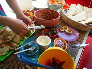 I love nothing more than a good excuse to throw a food fest, so the culmination of these two fantastically treat-related holidays seemed like the perfect fit. Boy and I (with help from mom and dad – who are learning how to cook without salt!) whipped up a salt-free shmorg-borg of brunchy delights: Horoses and matzoh, deviled eggs, baba ganoush, two gorgeous fruit tarts care of Annie, slow-cooked scrambled eggs, macaroons, and an unbelievable fennel and sweet potato hash with spice-rubbed flank steak.