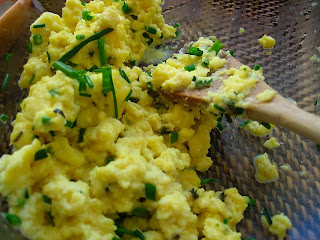 6. When the mixture becomes smooth and thick, stir in 2 tablespoons of creme fraiche (or really, as much as you like – I find that the creamier the eggs the better) and the chives.