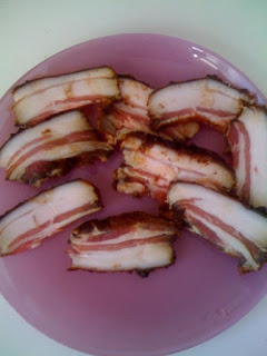In the meantime, feast your eyes on the transformation of my pork blocks into beautiful slices of “could-be” bacon. I cannot wait until they taste as good as they look.